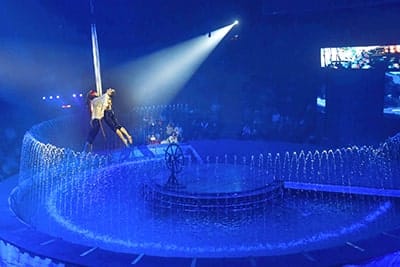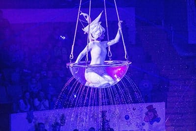 Eine einzigartige Bühne ihrer Art, auf der die Zirkusmanege sich in eine Wasserfläche verwandelt und Tausende von leuchtenden Fontänen tonnenweise Wasser in die Höhe schießen lassen, um es in einen märchenhaften Regen zu verwandeln und so die Artisten und das Publikum in eine erstaunliche Atmosphäre eintauchen. Das alles zieht nicht nur Kinder, sondern auch Erwachsene in seinen Bann!