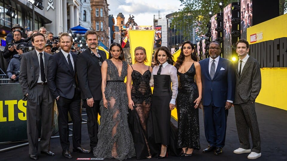 Regisseur Jake Schreier, Produzent Kevin Feige und Executive Producer Brian Chapek schritten stilvoll zusammen mit ihrer Starbesetzung über den schwarz-gelben Teppich. Florence Pugh, Lewis Pullman, Wyatt Russell, Geraldine Viswanathan, David Harbour, Hannah-John Kamen und Julia Louis-Dreyfus, als die Marvel Studios dieses unkonventionelle Team von Antihelden im Marvel Cinematic Universe willkommen hießen.