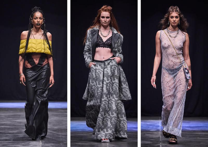 Der Zauber liegt in den ungleichen Verbindungen: Schützende und funktionale Silhouetten verschmelzen mit filigranen Texturen, verdrehten Lagen, sowie dekorativen Accessoires aus Gold und Edelsteinen. Satte Schattierungen und vielfältige Texturen erzeugen eine illusorische Spannung. Wunderbar recycelte „Leftovers“ aus Skibekleidung & Schmuck in Kombination mit nachhaltigen Dessous und handverlesenen Spitzen bringen ihre Kreativität in ausgefallenen Designs zum Ausdruck.