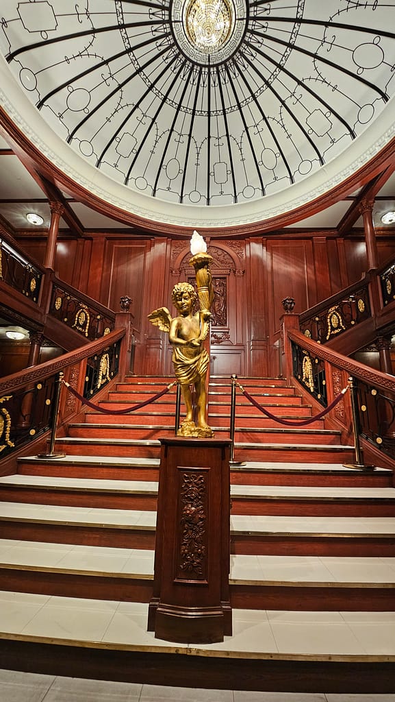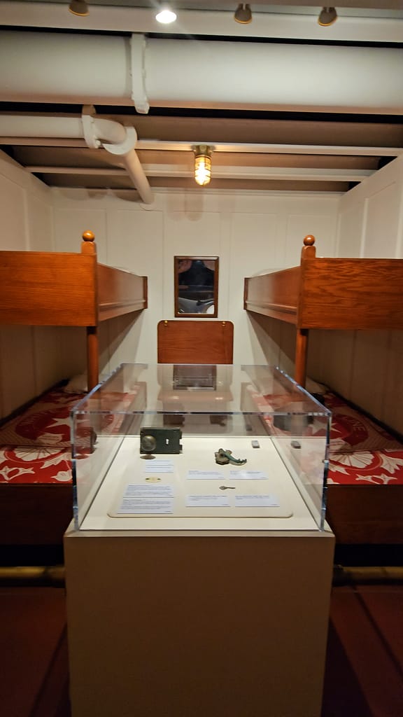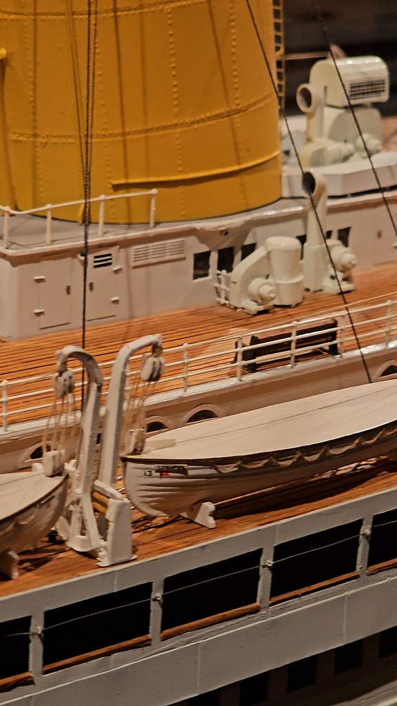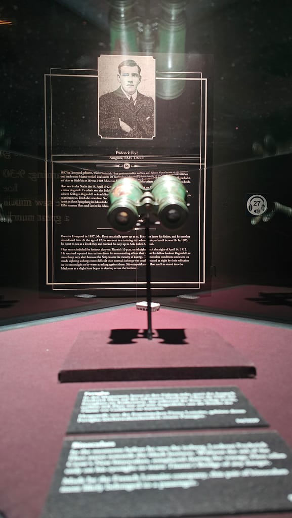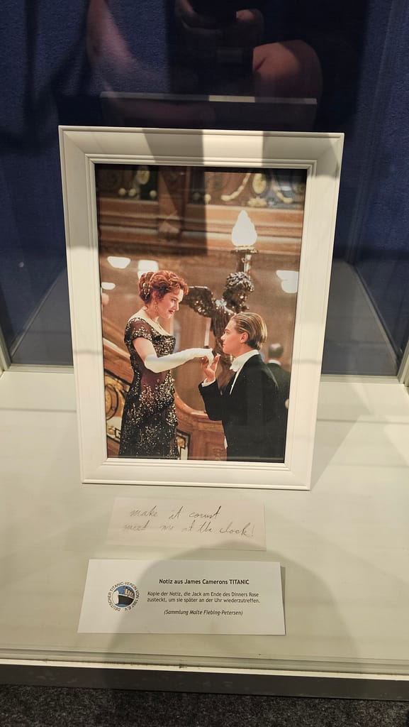 Beim Betreten der Freitreppe und des Rundgangs während der Ausstellung, wird deutlich, das Jack Dawson (Leonardo DiCaprio im Film) auf der abgetrennten Wand, wo Rosé DeWitt Bukater sich aufhielt zum Schluss des Films, Platz gehabt hätte. Ja Jack hätte mit rauf gepasst wenn sie gerutscht wäre, aber der Auftrieb wäre wissenschaftlich dann ein Problem gewesen. Mit 14 Jahren galt man übrigens zu damaligen Verhältnissen schon als Erwachsener was es den Jungen Männern der dritten Klasse damals fast unmöglich machte zu überleben. –(Frauen und Kinder zu erst!)–