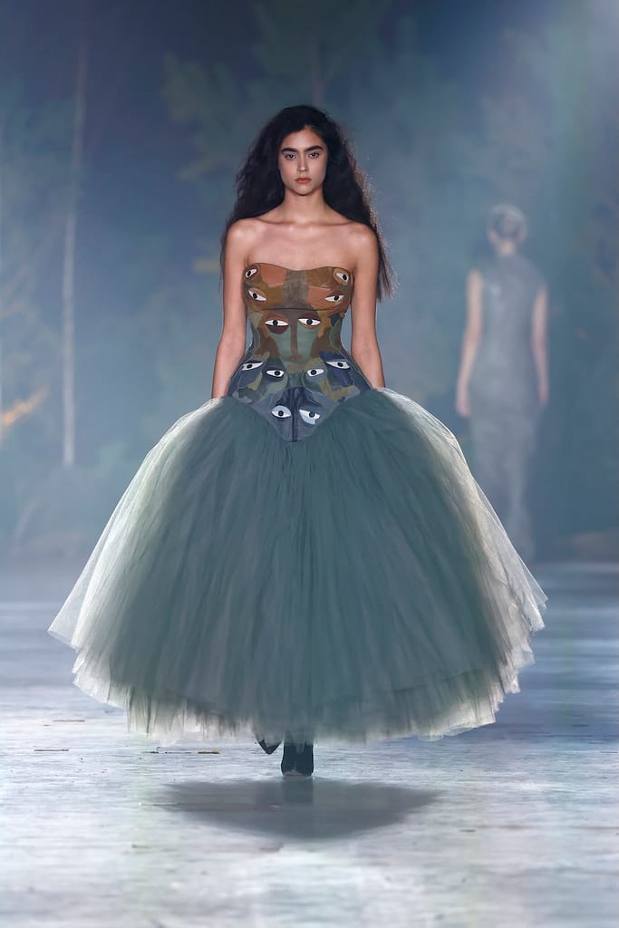 Teile der Kollektion wirken bewusst unvollständig – organisch gewachsen, wie Momentaufnahmen eines fortlaufenden Prozesses. Großvolumige Tüllsilhouetten und ausladende Rüschen, scheinen jenseits klarer Konturen wie in steter Bewegung. Dieses Spiel von Form und Auflösung setzt sich in surreal gestalteten Gesichtern aus aufwendigem Leder-Patchwork und Perlenapplikationen fort, inspiriert von der expressiven Bildwelt Edvard Munchs und Ernst Ludwig Kirchners: verzerrt, intensiv, zwischen innerer Anspannung und Ausdruckskraft oszillierend. Ein wesentlicher Bestandteil der Kollektion sind selbst gewebte Stoffe aus gesammelten Restmaterialien. Seile, Woll-, Filz- und Lederreste, Bast und andere Naturmaterialien verschiedenster Herkunft verschmelzen zu einem neuen, eigenständigen Gewebe. Handgestrickte Pullover, Mützen, Handschuhe und Accessoires von grober Struktur fügen der Kollektion eine Ebene von Schutz und Wärme hinzu. Leichte, chiffonartige Materialien legen sich wie Nebel im Morgengrauen über schwere Texturen, lösen sie partiell auf und schaffen flüchtige Kontraste. So fügt sich das Bild einer Kollektion, die zwischen Natur und Kunstwelt, zwischen äußerer Realität und innerer Wahrnehmung oszilliert – geheimnisvoll, roh und zutiefst emotional.