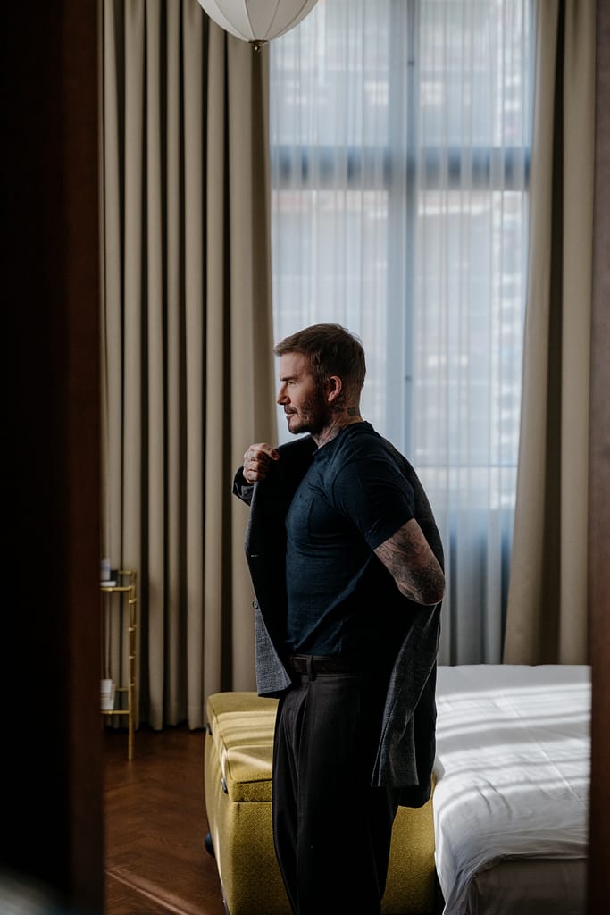 Am Abend ging es im ikonischen Berliner Kaufhaus Kaufhaus des Westens (KaDeWe) weiter, das seine Türen öffnete, um den neuen BOSS BY BECKHAM Pop-up-Store sowie den Brand-Takeover in den Schaufenstern und an der Fassade zu präsentieren. Zur Eröffnung trug David weitere Key-Pieces aus der Frühjahr/Sommer 2026 Kollektion: eine weiche braune Nappa-Lederjacke mit einem kurzärmeligen Strickshirt aus cremefarbener Schurwolle, eine braune Hose aus elastischer Baumwolle und cremefarbene Leder-Sneakers mit kontrastfarbenen Veloursleder-Details. Eine gekonnte Mischung aus himmlischer legerér Kofferware und sportlichen Details.